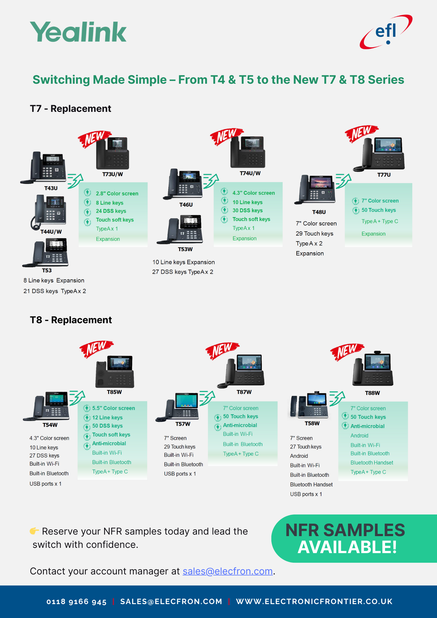 Electronic Frontier is excited to introduce Yealink’s brand-new T7 and T8 SIP Phone Series, the latest evolution of their award-winning desk phone portfolio. Designed to empower today’s hybrid and modern workplaces, these next-generation IP phones bring powerful hardware and software upgrades, delivering a smarter, faster, and more sustainable communication experience for every business environment.